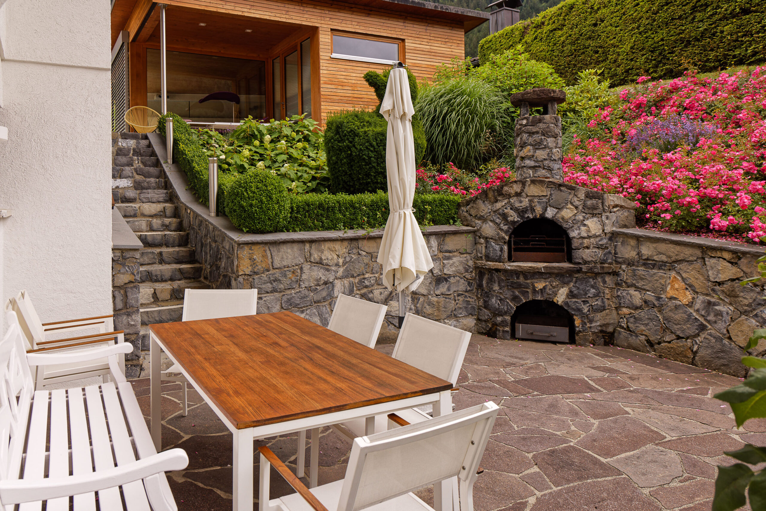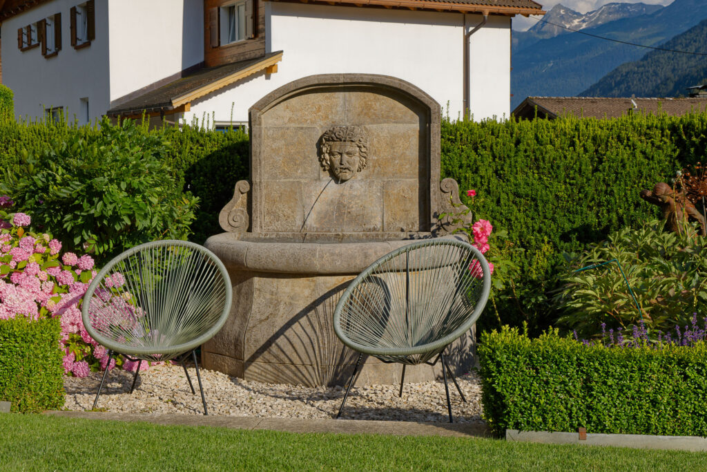 - Große Terrasse mit Anschluss an den Garten – mit Brunnen und Möglichkeit, den Steingrill zu benutzen